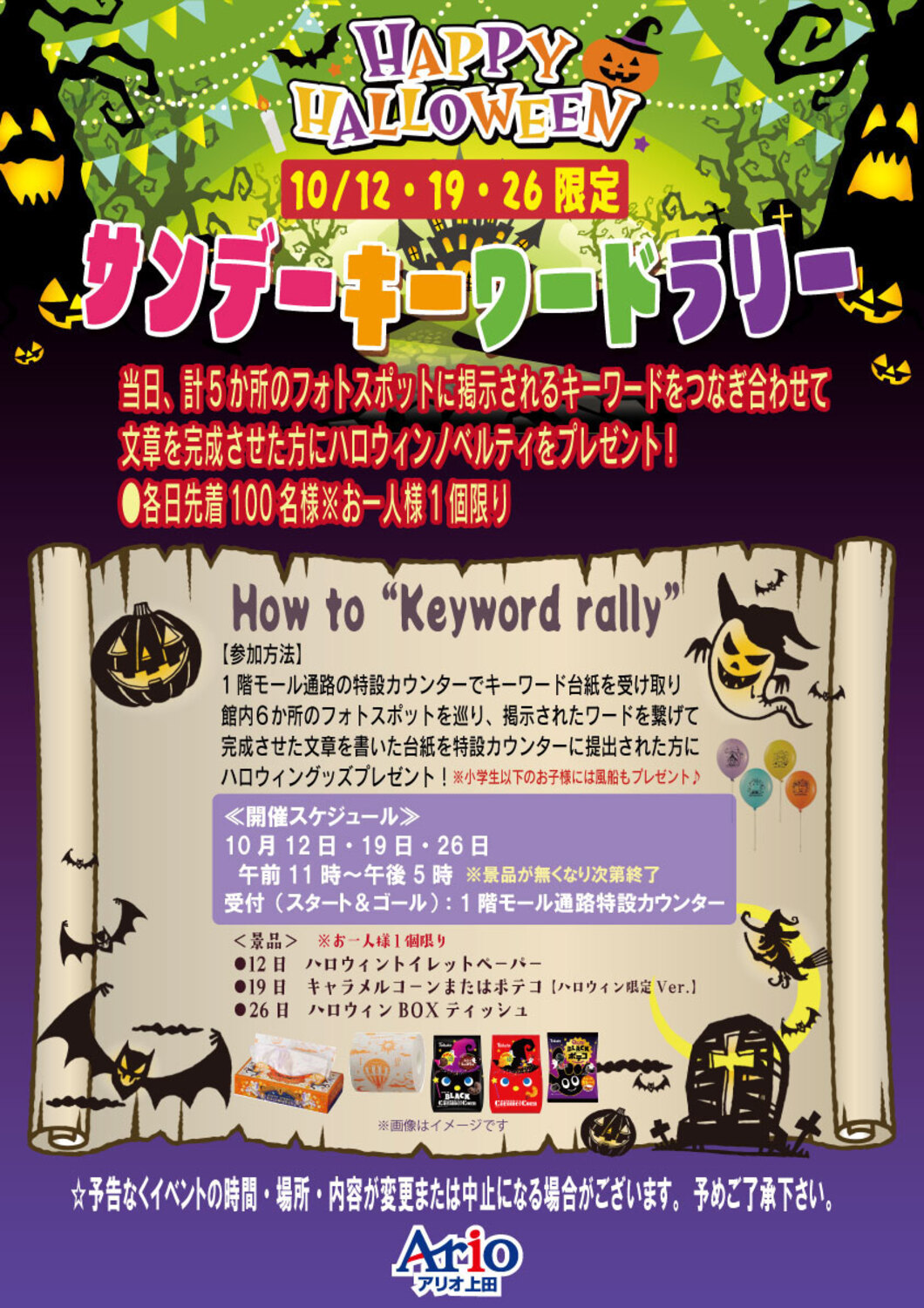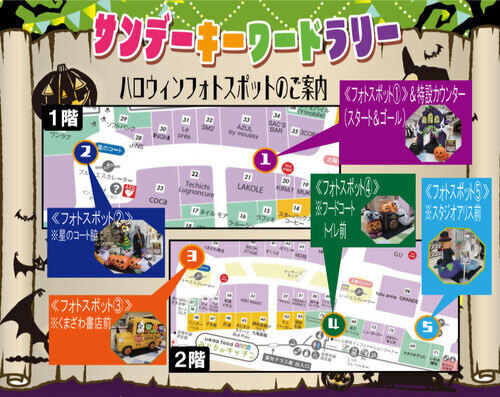 館内5か所に点在しているハロウィンフォトスポットにて掲示されているキーワードを繋ぎ合わせて文章を完成させたら