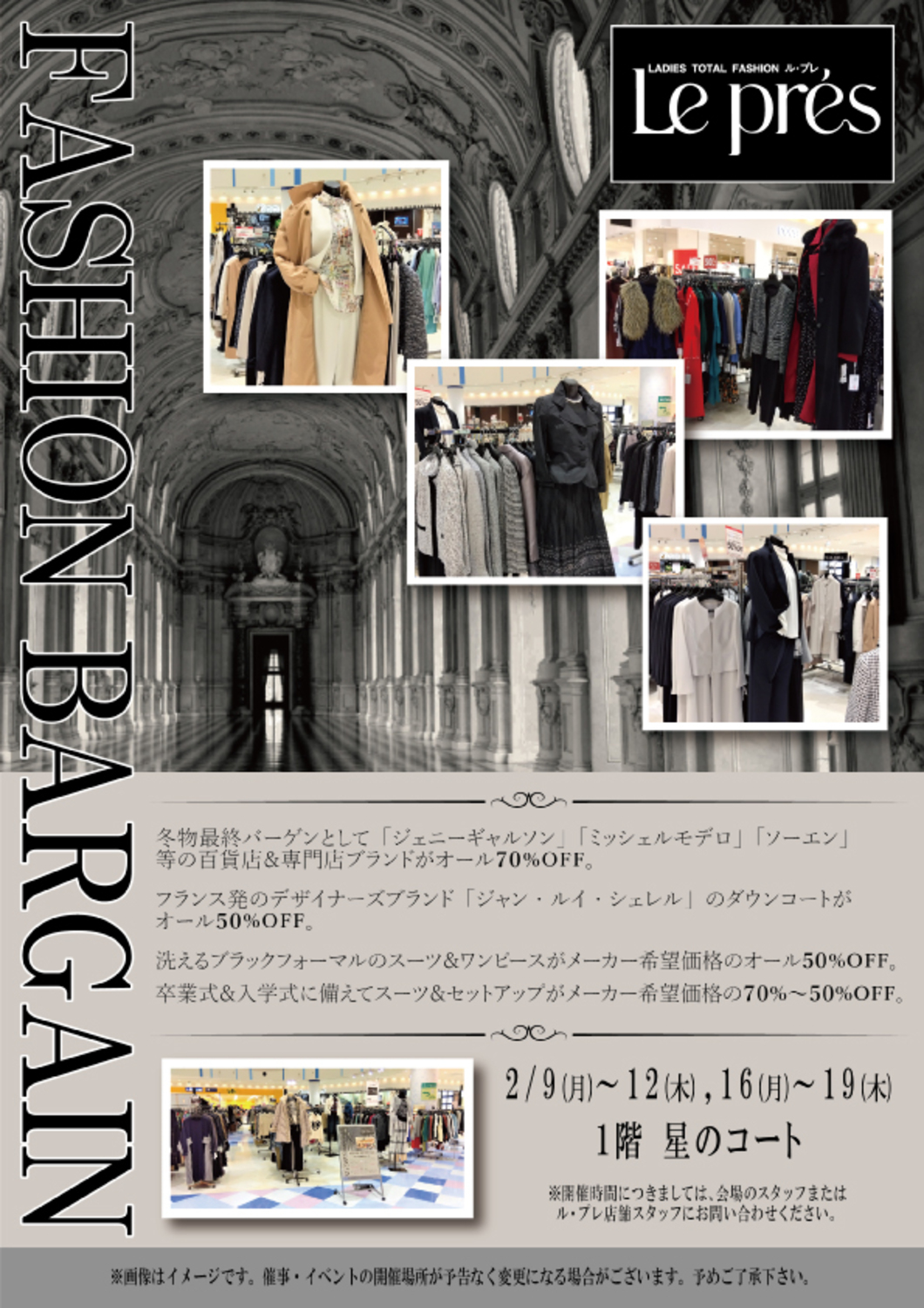 冬物最終バーゲンとして「ジェニーギャルソン」「ミッシェルモデロ」「ソーエン」等の百貨店&専門店ブランドがオール70%OFF。