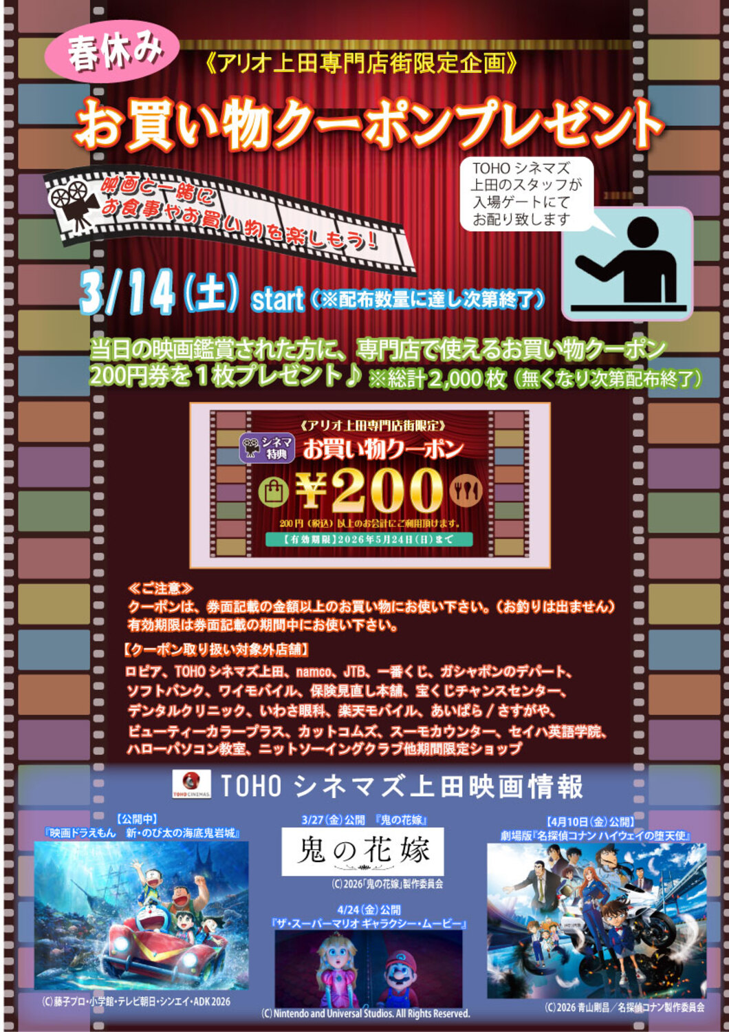 TOHOシネマズ上田にて3/14(土)当日の映画鑑賞された方に、