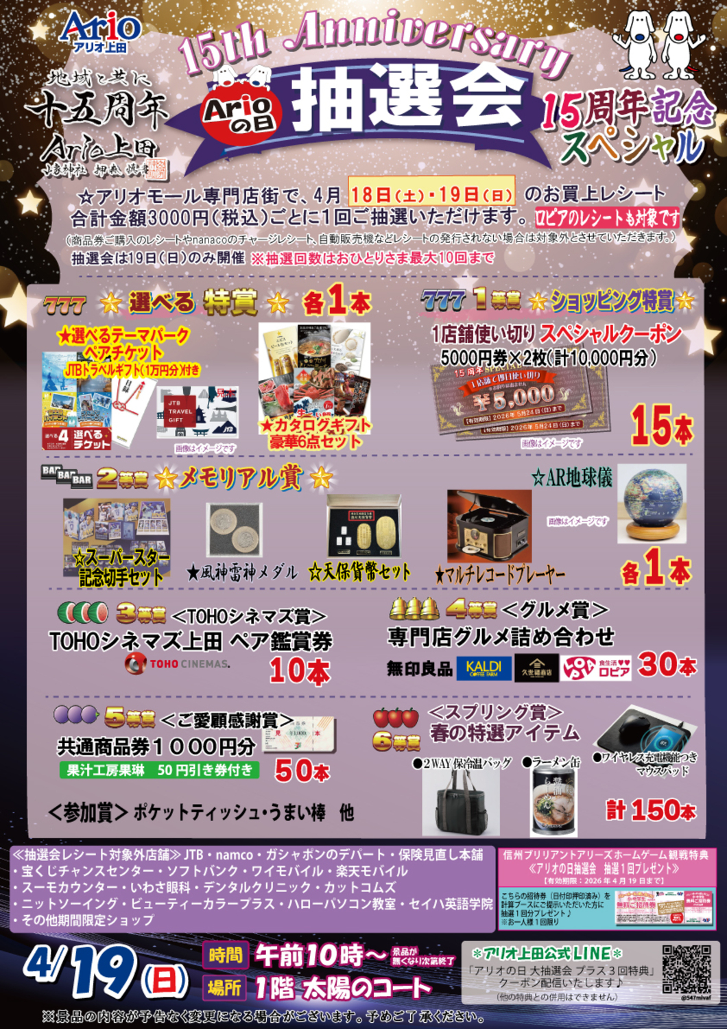 <アリオ上田LINE会員限定 「レシート分プラス3回」特典プレゼント> ※当日、会場の計算ブースにてLINE特典の画面をご提示ください。