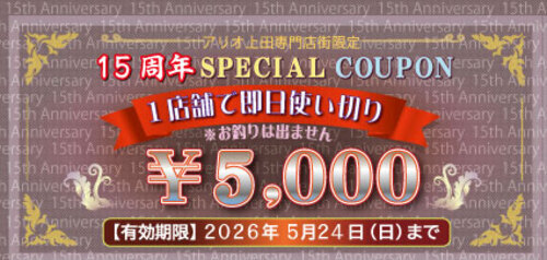 【1等賞】15周年スペシャルクーポン(5,000円券2枚セット)15本