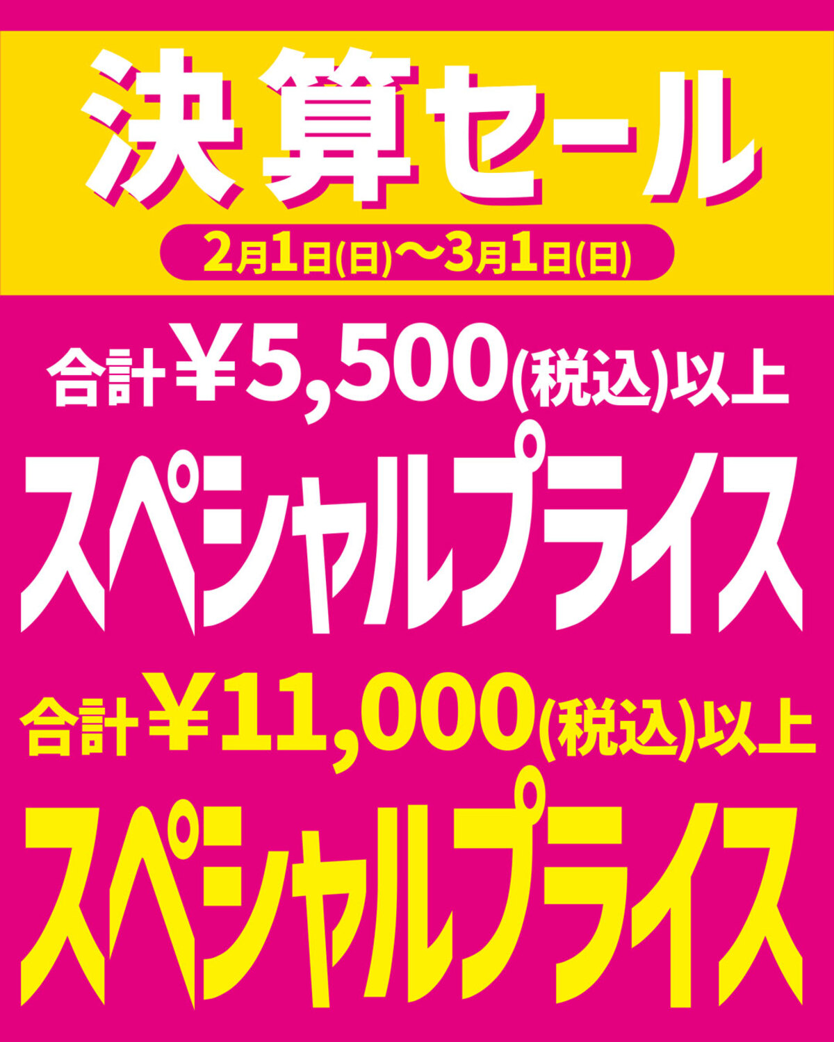 決算セール開催中!店内商品¥5500(税込)以上で対象商品が10%OFF、さらに¥11000(税込)以上で30%OFF!