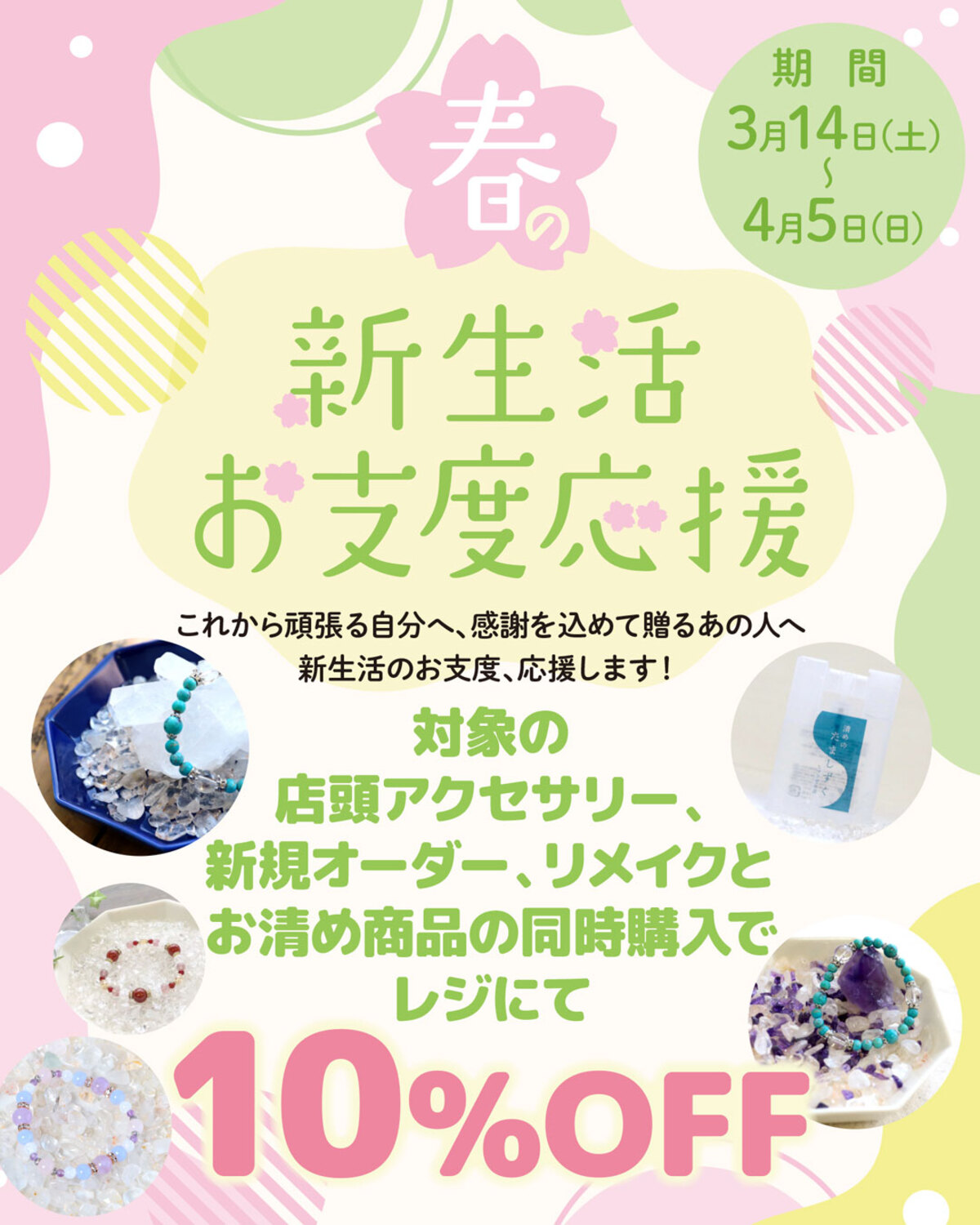 春は出会いと別れの季節!これから頑張る自分に、感謝を込めたあの人への贈り物に新生活のお支度を応援します!店内の対象アクセサリー、オーダー・リメイクとお清め商品を同時購入で、レジにて10%OFF!