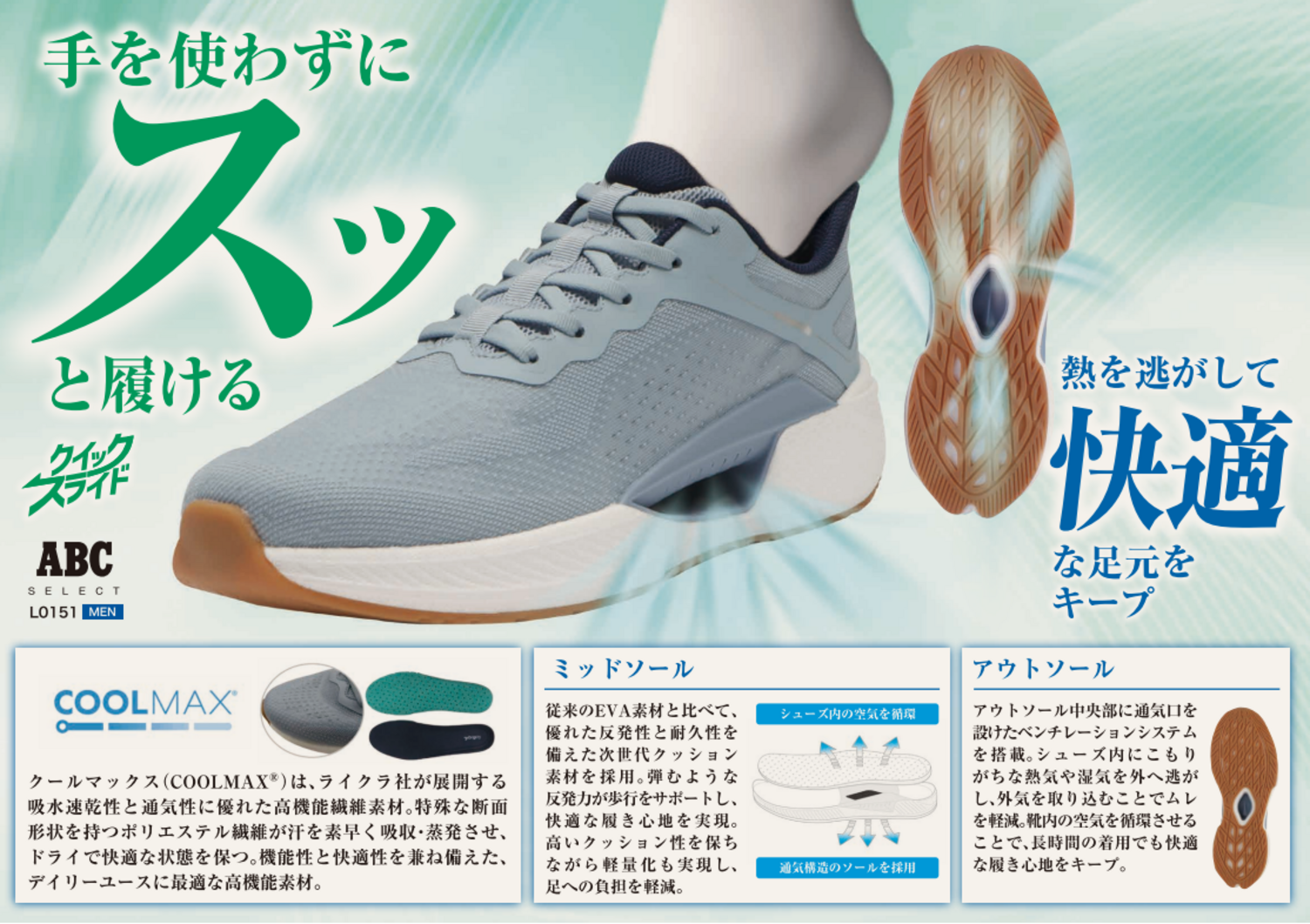 アッパーには冷感素材、ライニングとインソールにはCOOLMAX(吸収速乾性と通気性に優れた)冷感資材を使用し爽やかな履き心地。